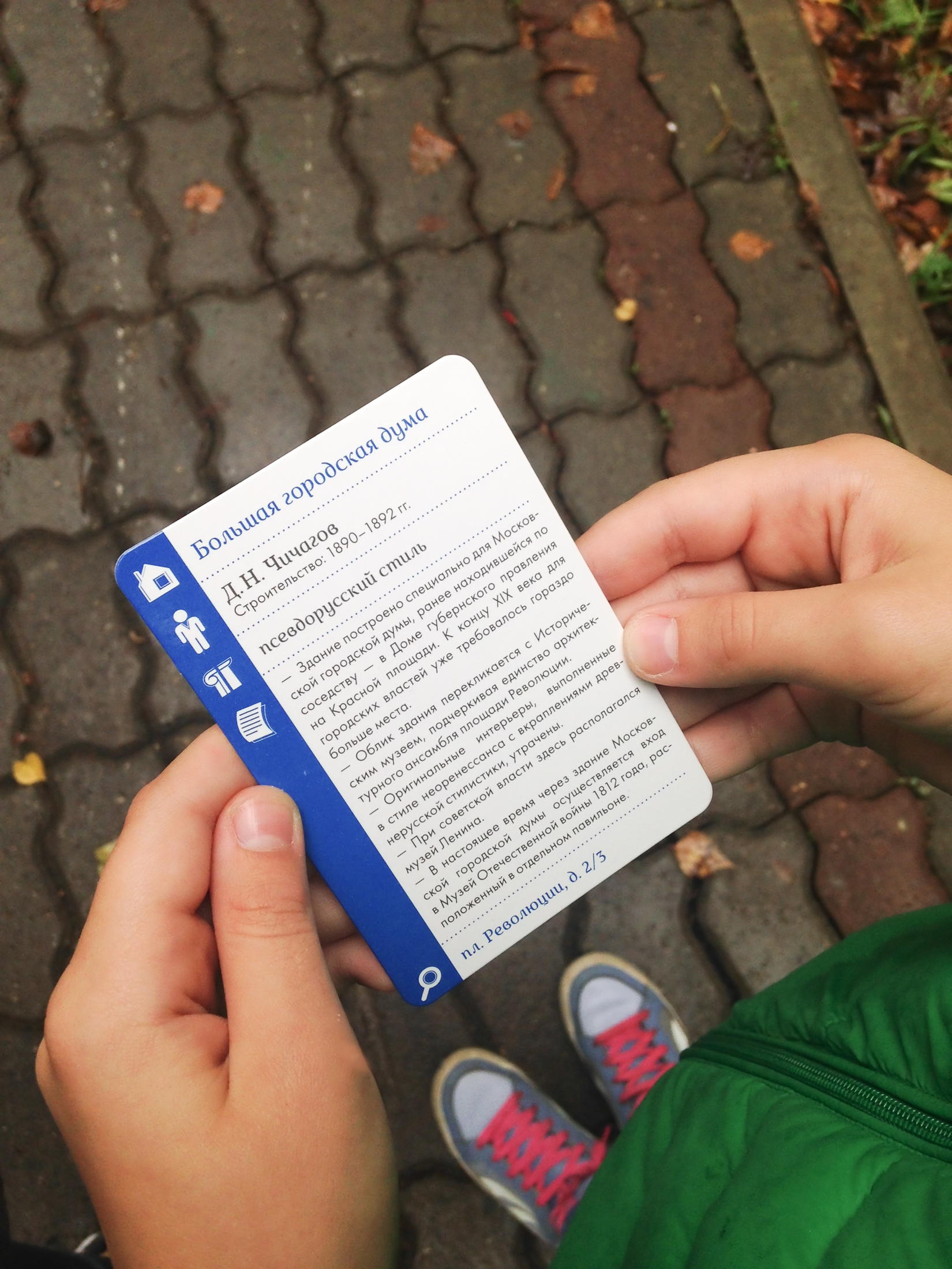 Карточек много и они сделаны и плотной бумаги и их можно просто брать с собой при выезде в центр города и зачитывать детям отдельно от самой игры.